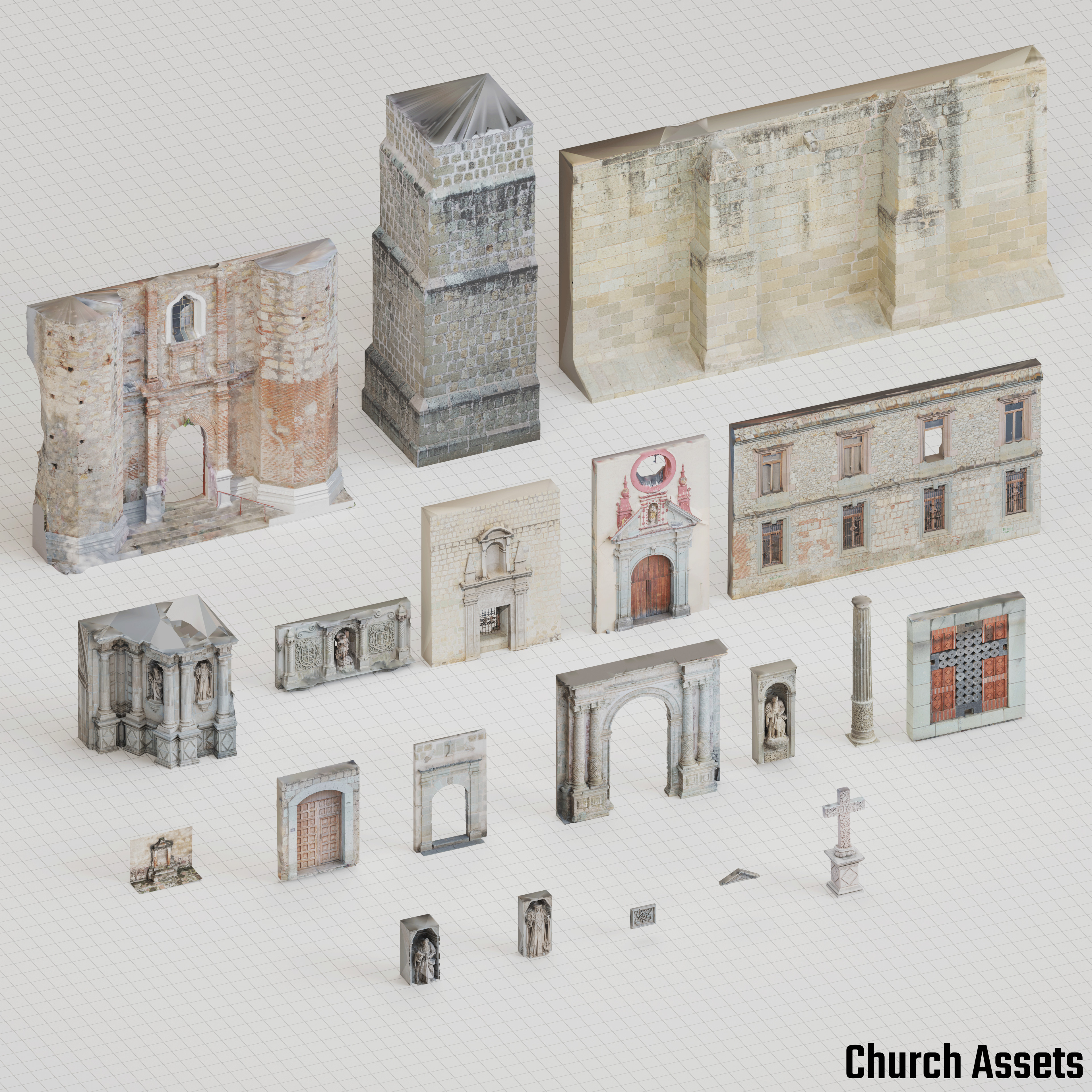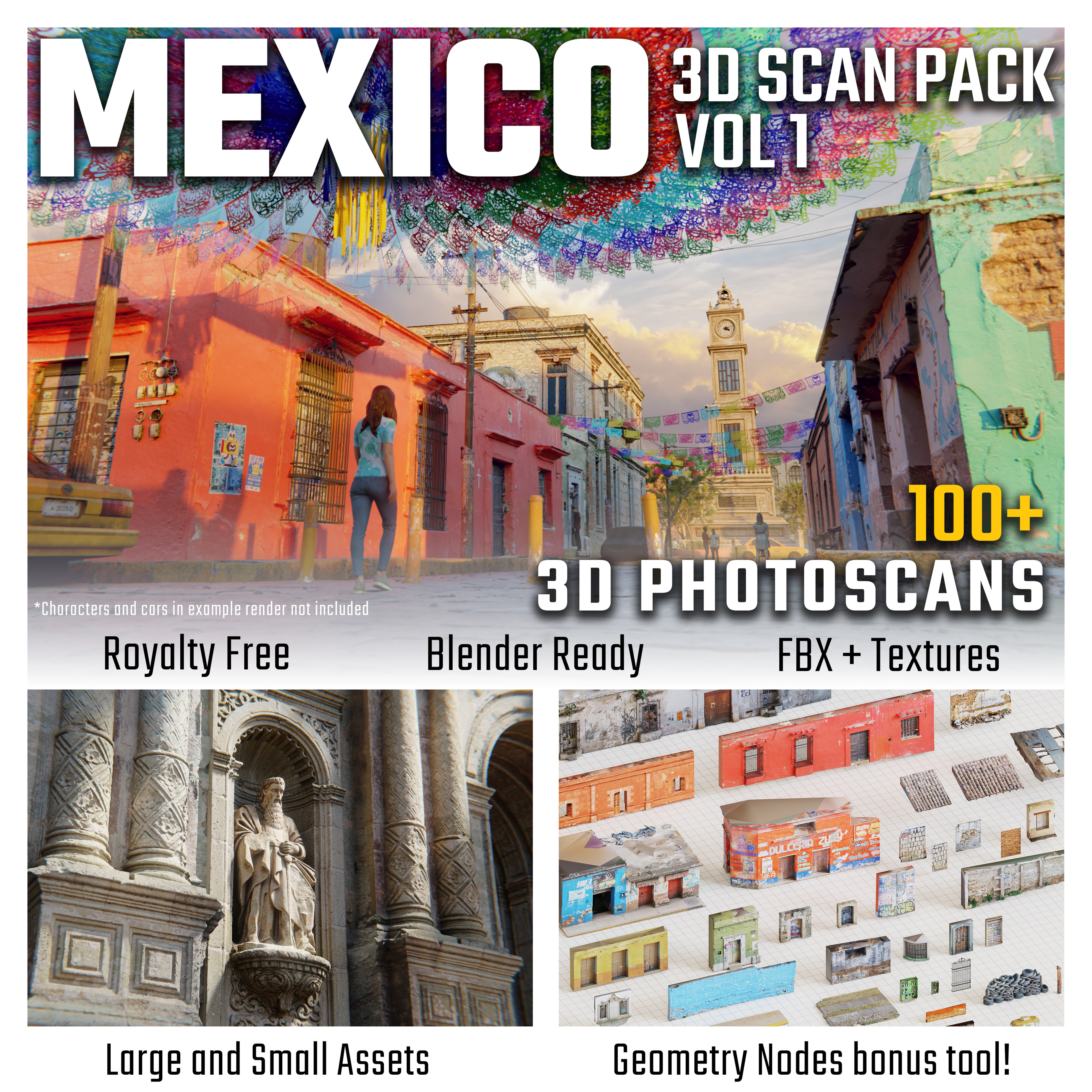 People scans and cars included in example render are not included in the asset pack.